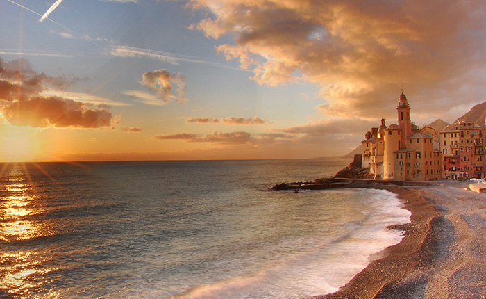 Aux confins du golfo Paradiso, Camogli aligne ses hautes maisons colorées le long d’une plage de galets. Son nom fait référence à une époque où, les hommes étant partis à la pêche, la population était majoritairement peuplée de femmes  (Camogli signifie “casa delle mogli”, c’est-à-dire “maison des femmes”).