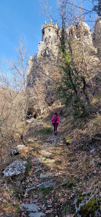 Di fronte il cartello indica la salita per Andagna, preso il sentiero si sale su una ripida mulattiera sino a trovare alla destra il bivio per salire alla Rocca di Andagna.